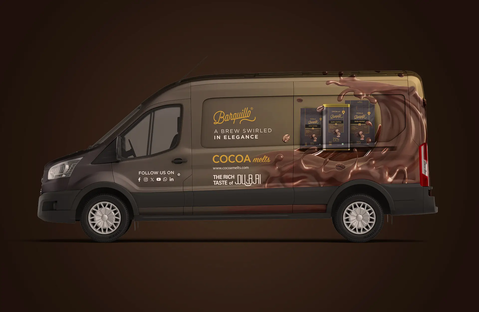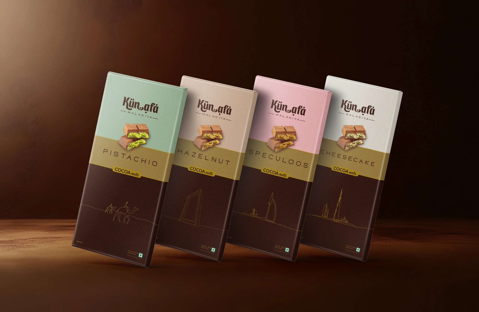 To establish the brand as a premium gourmet brand, we began by designing rich, standout packaging for our hero products — Barquillos in five flavours and Dubai’s iconic Kunafa chocolate. We extended this premium identity by designing delivery vans with distinct visual treatments highlighting each flavour.